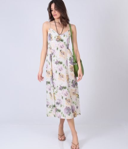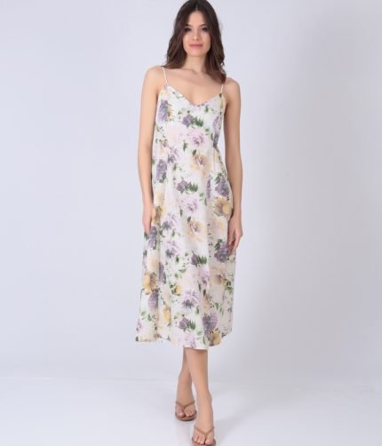 Φόρεμα φλoραλ midi με λεπτές τιράντες και άλφα γραμμή και σφιγκοφολιά πλάτη