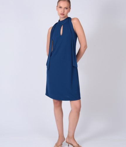 Ελαστικό φόρεμα με δέσιμο στον λαιμό , παρτούς ώμους και άνοιγμα στο ντεκολτέ